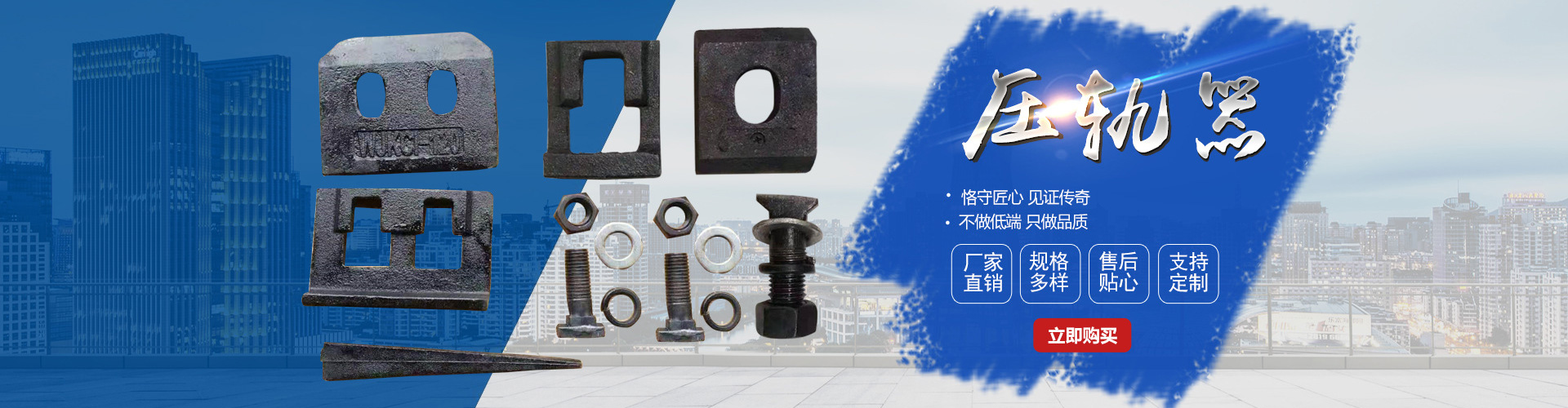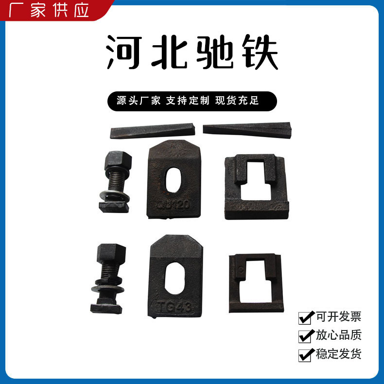 主要產(chǎn)品:鐵路配件、行車(chē)配件、工礦配件、魚(yú)尾板、道釘、壓軌器、軌道壓板、軌距拉桿、護(hù)軌扣板、T型螺栓、魚(yú)尾螺栓、彈條、軌距擋板